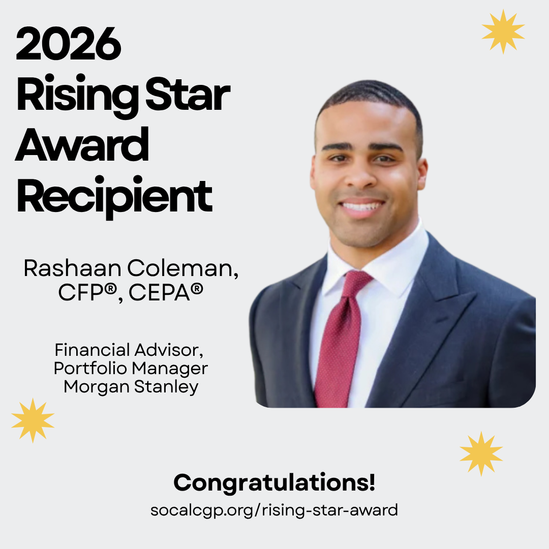 Rising Star Award RecipientsThe SoCalCGP Rising Star Award celebrates an emerging professional in charitable gift planning. Established in 2024, this annual award recognizes individuals who demonstrate initiative, innovation, and leadership, and who are actively contributing to and supporting the gift planning field. Their work reflects SoCalCGP’s core values of inclusion, community, integrity, education, and leadership, and highlights a strong commitment to professional growth and service. Recipients are recognized at the Western Regional Planned Giving Conference and featured on SoCalCGP’s website and associated media. Selection criteria include demonstrated success in charitable gift planning, leadership potential, between three and ten years of service in the field, and engagement with SoCalCGP or other professional organizations. ![]()